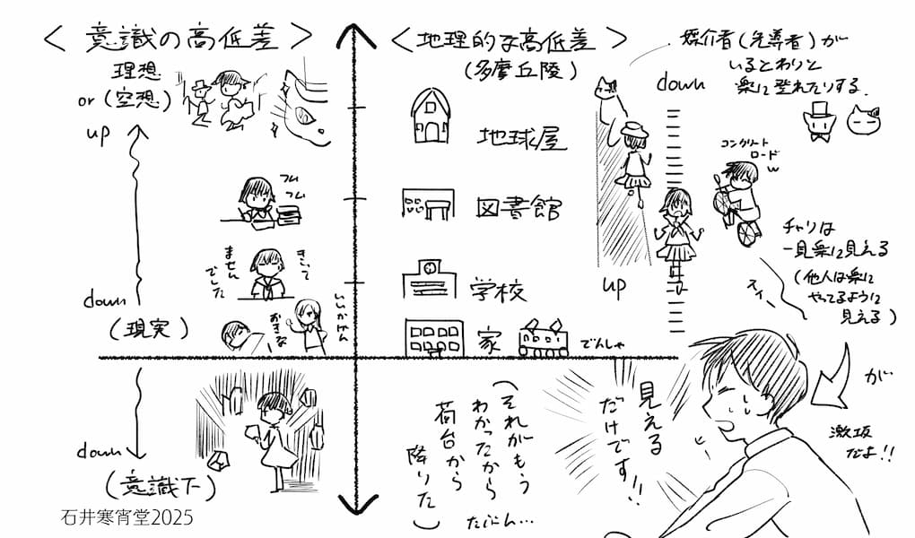 作品中に大きな垂直の軸を立ててみる。軸の片方の目盛りは現実の多摩丘陵の高低差をあらわす。家や学校や図書館、そして作品のキーポイントとなる「地球屋」は高低差で隔てられていて、この町に暮らす雫は、坂や階段を頻繁に上り下りすることになる。